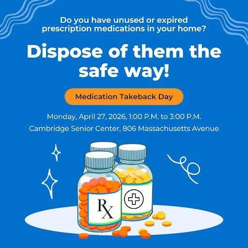 The Cambridge Public Health Department, Cambridge Police Department, and Cambridge Council on Aging are hosting a Medication Takeback Event on Monday, April 27 from 1:00 p.m. to 3:00 p.m. at the Cambridge Senior Center (806 Mass Ave). Personnel will be available on-site in the lobby to accept unwanted or unused prescriptions, over-the-counter meds, and vitamins. Sharps, liquids, and creams/ointments will NOT be accepted. For any questions about the event or safe medication disposal year-round, please contact Danielle McPeak, the CPHD Prevention and Recovery Specialist, at dmcpeak@cambridgepublichealth.org.
